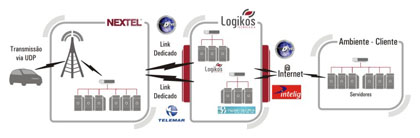 O processo de rastreamento e monitoramento da solução Logikos baseia-se na comunicação entre o módulo rastreador LR800 – que contém um GPS e está instalado no veículo – e a aplicação de gestão logística de frota, disponibilizada pela Logikos, em dois servidores paralelos e redundantes, fisicamente separados. O sistema de gestão logística também é responsável pela comunicação com os sistemas legados dos clientes, bem como pela disponibilização de relatórios e mapas de monitoração. A figura, a seguir, ilustra o funcionamento do sistema, com base na descrição do fluxo de informações entre o veículo e o sistema de gestão logística, bem como o processo de integração e disponibilização dos relatórios e mapas de monitoração de frota.